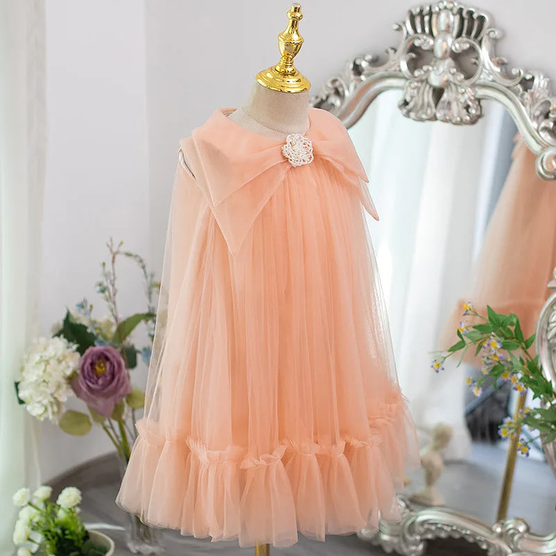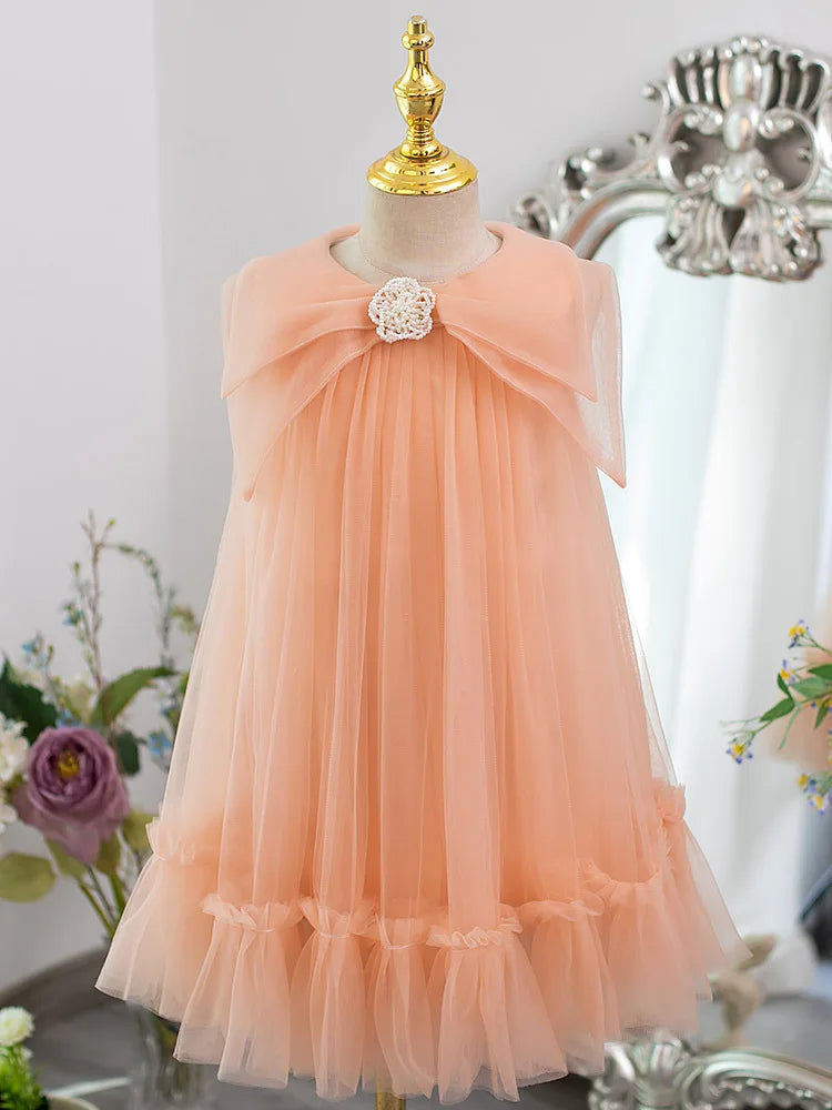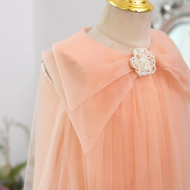 Elegant Peach Girls’ Dress – Flowing Tulle with Removable Pearl Brooch