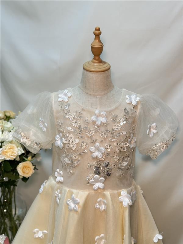 An elegant champagne-colored tulle dress adorned with delicate 3D floral appliqués and shimmering sequins. The airy puff sleeves and layered skirt add a graceful touch, making it perfect for Eid, birthdays, and special celebrations. Bag not included.