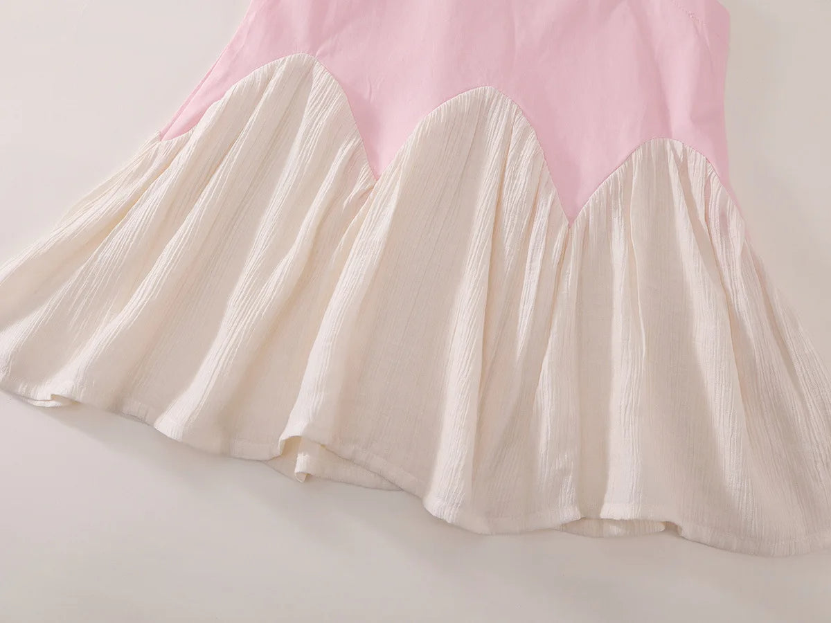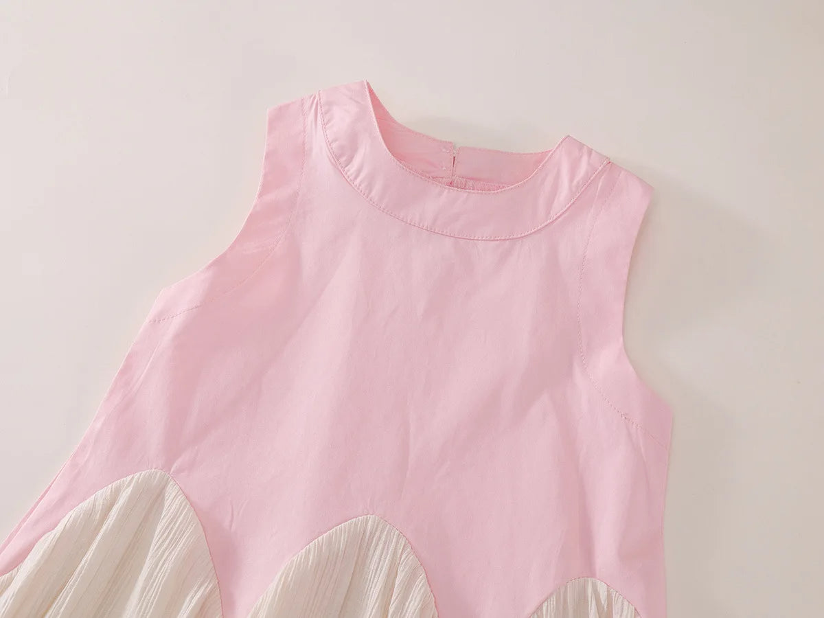 A stylish and breathable girls’ dress crafted from a soft cotton blend with an airy gauze skirt. Featuring a playful colorblock design, bow detail, and A-line silhouette, it’s perfect for summer days or normal winter weather in GCC, birthdays, and casual outings. Available in two colors: pink and blue.